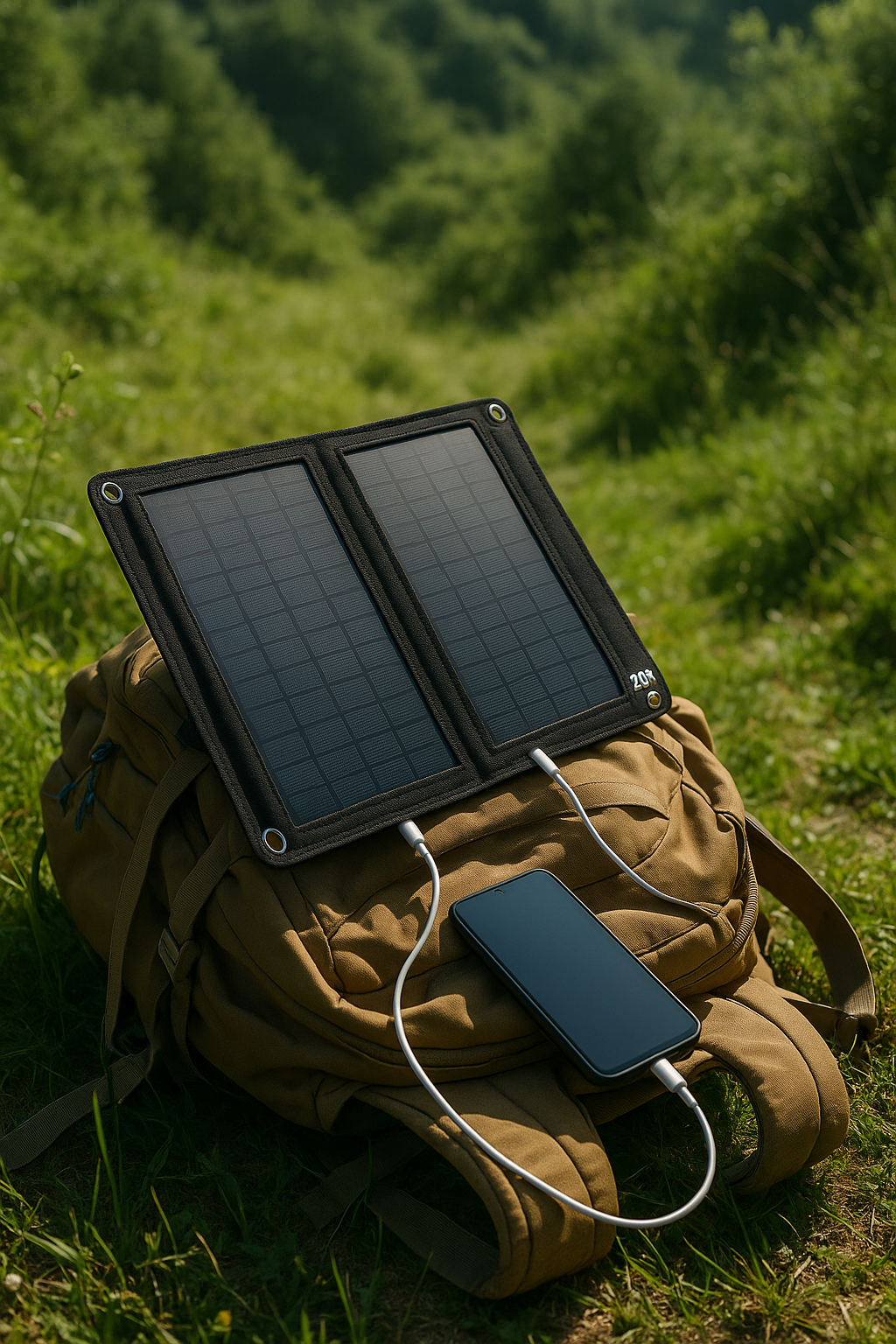 Cargador solar compacto y resistente al agua, ideal para senderismo y viaje. Dos salidas USB‑C y ganchos de sujeción.