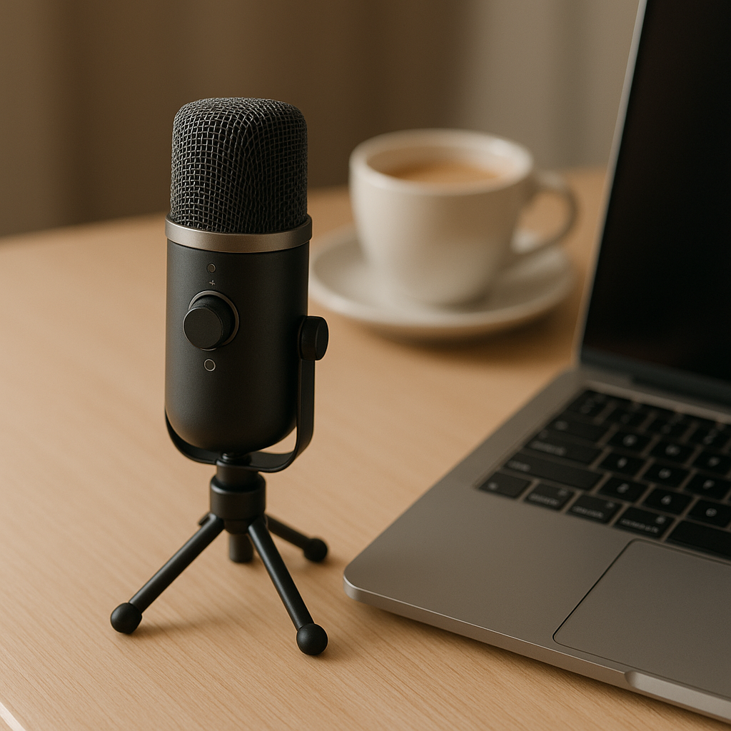 Micrófono compacto para podcast y video. Soporte de mesa y filtro antipop incluidos.