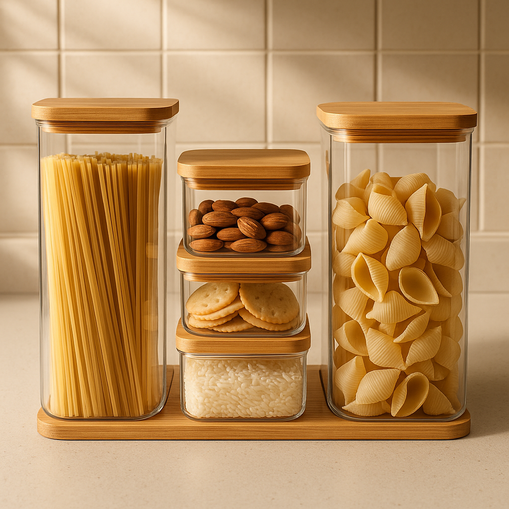 Contenedores apilables herméticos para despensa.